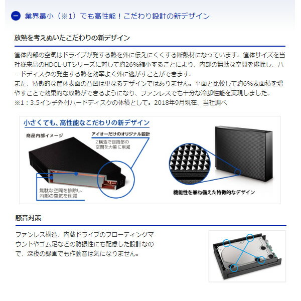 ■ IOデータ ■小さくても、高性能!パソコン/テレビ録画対応ハードディスク◆ 主な特長 ◆◆ 主な仕様 ◆容量3TB電源AC100V 50/60Hz消費電力8.2W(typ)インターフェイスUSB 3.1 Gen 1(USB 3.0)/USB 2.0コネクタ形状USB(Micro B)×1出荷時フォーマットNTFS外形寸法約34(W)×172(D)×115(H)mm ※突起部分含まず約35(W)×172(D)×116(H)mm ※ゴム足部分含む設置条件縦置き・横置き質量(本体のみ)3TB:約800g使用温度範囲5〜35℃使用湿度範囲20〜80% ※結露なきこと