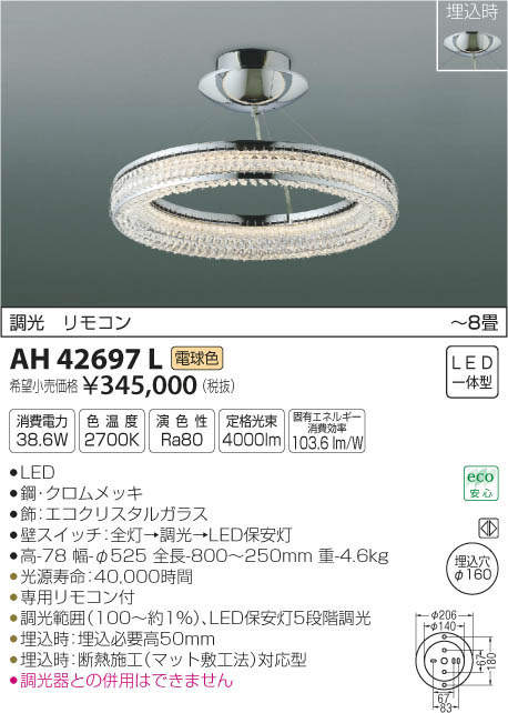 サイズ:高さ78 幅φ525 全長800〜250 埋込穴径φ160mm 埋め込み穴:φ160 重さ:4.6kg 消費電力:38.6W 色温度:2700K 演色性:Ra80 光源寿命:40,000時間 専用リモコン付 調光範囲(100〜約1%)、LED保安灯5段階調光 埋込時:埋込必要高50mm 埋込時:断熱施工(マット敷工法)対応型 調光器との併用はできません ※色温度:2700K 材質・色:鋼-クロムメッキ、飾り エコクリスタルガラス LEDユニット:LED一体型 点灯順序:壁スイッチ:全灯→調光→LED保安灯 電気工事:取付には、専門家による電気工事が必要です。